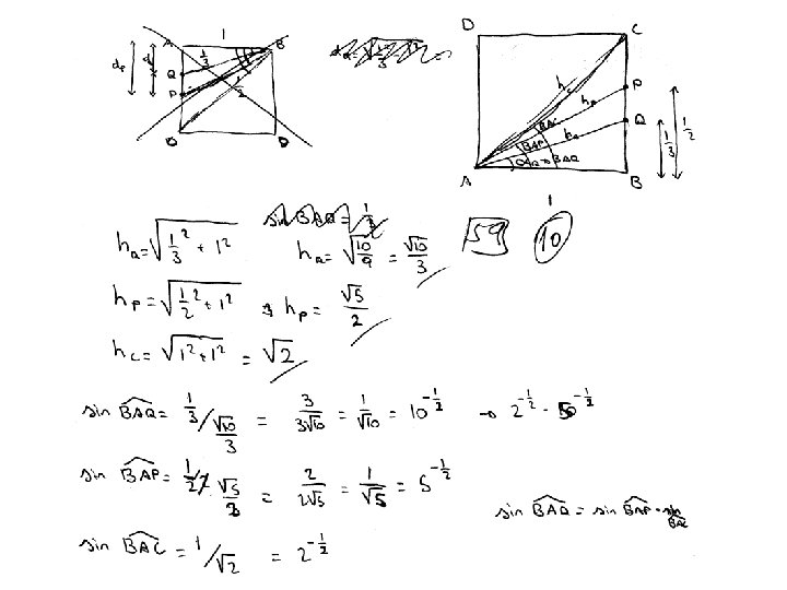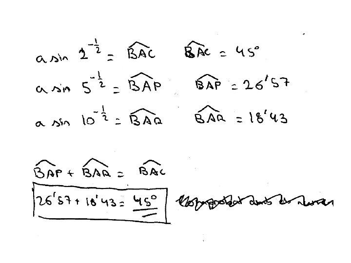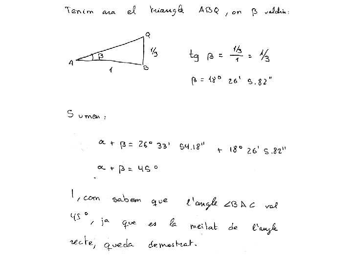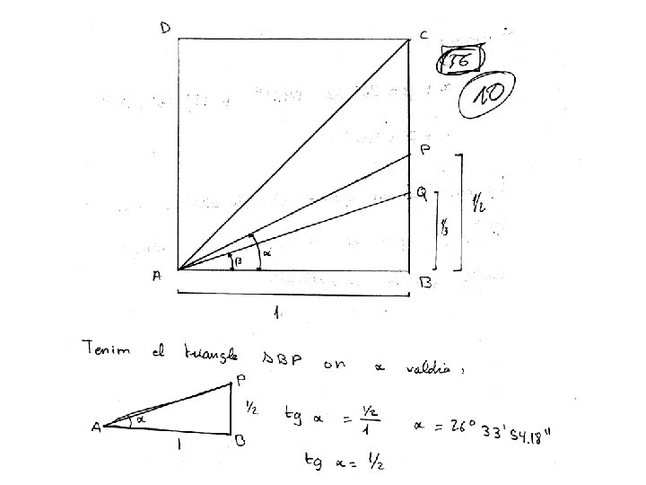1. - Es considera un quadrat ABCD de costat 1. Siga P un punt del costat CB tal que la distància de P a B és ½, d(P, B) = ½ ; i Q un altre punt de CB tal que la distància de Q a B és 1/3, d(Q, B) = 1/3. Proveu que és verifica BAC = BAP + BAQ. SOLUCIÓ: Proporcionarem quatre solucions SOLUCIÓ 1: Dibuix amb regla i compàs, comprovant la suma d’angles amb el compàs SOLUCIÓ 2: Utilizant raons trigonomètriques, per example la tangent i calculadora