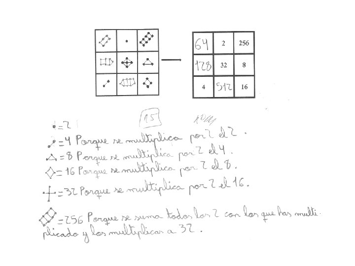 64 2 256 128 32 8 4 512 16 Per completar el problema ens queda vore l’estructura de la taula de la dreta: Si multipliquem els nombres de les caselles en linea o en diagonal dona el mateix nombre (ja que es sumen els exponenets de les potències), així per ejemple: 64 · 256 = 26 · 21 · 28 = 215 = 32768 ( 1 a. fila) 2 · 32 · 512 = 21 · 25 · 29 = 215 = 32768 (2 a. columna) 64 · 32 · 16 = 26 · 25 · 24 = 215 = 32768 (diagonal principal)