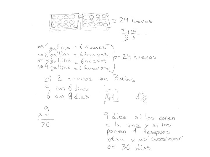 3. - UNA GALLINA, QUATRE GALLINES. . . - Una gallina pon dos ous cada tres dies. Quants dies es necessitaran perqué quatre gallines ponguen dues dotzenes d’ous? Solució. - Es tracta d’un problema de proporcionalitat: hi han tres magnituts: nombre de gallines, nombre d’ous, nombre de dies relacionades proporcionalment entre eeles ( al multiplicar un valor d’una d’elles per un factor l’altra magnitud queda multiplicada per el mateix factor, per example, el triple de gallines pondran el triple d’ous, si esperem el doble de dies pondran el doble d’ous). Per contestar la pregunta de l’enunciat poden seguir diverses tàctiques: (A). - Una gallina pon per dia, per tant 4 gallines pondran Com volem saber quants dies son necessaris per a que 4 gallines ponguen 24 ous, caldrá dividir el nombre d’ous a pondre per la “velocitat de posta” de les quatre gallines