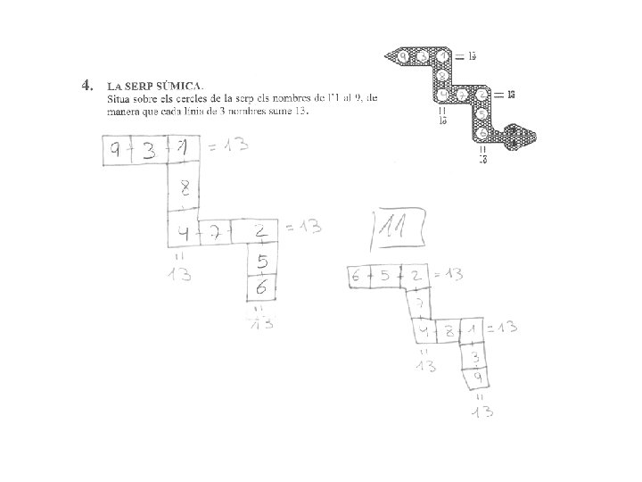 4. - LA SERP SÚMICA. - Situa en els cercles de la serp els nombres de l’ 1 al 9, de manera que cada linea de tres nombres sume 13 Solució: Despres de fer alguns intents fallits com 2 8 3 1 6 4 7 5 6 7 2 2 8 3 9 1 nos en adonem que són importants els nombres que col·loquem en els vértexs de la serp (en roig en els casos anteriors) perqué són sumats dos vegades i perqué han de ser els nombres que més vegades facen apareixer suma 13