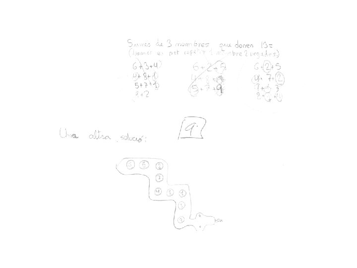 Les diferents sumes posibles (salvo alteració de l’ordre) que donen suma 13 són: 1+9+3 1+8+4 1+7+5 2+8+3 2+7+4 2+6+5 3+6+4 en les que l’ 1, 2, 3, 4, apareixen tres vegades i els demés menys vegades i per tant els que son aspirants a estar en els vèrtex. I ara hem de colocar estos trios en la serp. 3 1 6 5 8 9 7 2 4 8 1 6 3 5 9 1 3 8 4 6 8 2 2 7 4 1 Però també es plega a situacions sense sortida 9 6 5 7 1 3 9 1