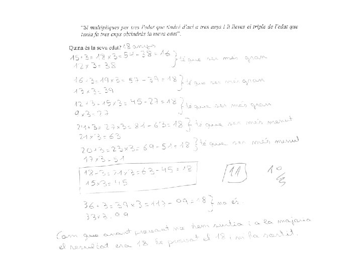 per tant 17 no es l’edat de la persona. Provem un altre nombre: Per tant la persona té 18 anys. Per als adelantats: L’enunciat es pot passar a expressión algebraiques com: on x és l’edat. Resolguen l’equació, resulta:
