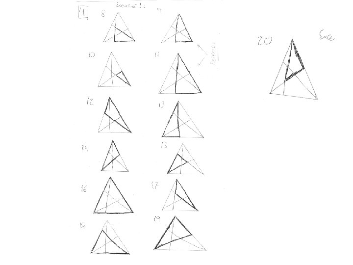 Solució. - Per poder comptar-los, hem fet dibuixos on es poden veure millor cadascún d’ells, a partir del dibuix original (colorejat en groc) Sembla que hi ha 17 triangles