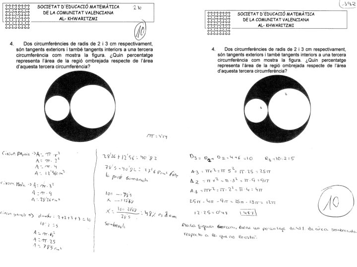 Problema 4. - Dos circumferències de radis 2 i 3 cm respectivament, són tangents exteriors i també tangents interiors a una tercera com mostra la figura. Quin percentatge representa l’àrea de la regió ombrejada respecte de l’àrea d’aquesta tercera circumferència? Solució. - A l’àrea de la circumferència gran li restarem la suma de l’àrea de les dos circumferències xicotetes i després pasrem a percentatges Área de la circumferència mes petita (r = 2) = π· 22 = 4 π Área de la circumferència intermedia (r = 3) = π· 32 = 9 π Área de la circumferència gran (r = 2 + 3 = 5) = π· 52 = 25 π Área de la zona ombrejada = 25 π – (4 π + 9 π) =12 π cm 2 I per últim una regla de tres: