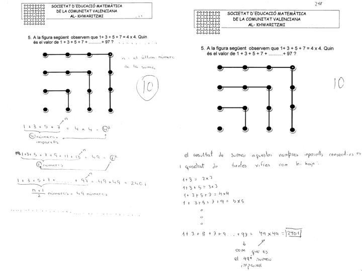 Problema 5. - A la figura següent observem que 1 + 3 + 5 +7 = 4 x 4. Quin és el valor de 1 + 3 + 5 + 7 +. . . . +97? Solució. - L’ùltim sumando és el que dona la dimensió del quadrat. Si l’últim sumando és 7 anyadim una fila (la superior) de 4 punts i una columna (la de la dreta) de 3 punts, i el quadrat és de 4 x 4. Si l’últim sumando fora 9 anyadiriem una fila (la superior) de 5 punts i una columna (la de la dreta) de 4 punts, i el quadrat sería de 5 x 5. Si l’últim sumando fora 97 anyadiriem una fila (la superior) de ((97 + 1)/2 =)49 punts i una columna (la de la dreta) de 48 punts, i el quadrat sería de 49 x 49. Per tant: 1 + 3 + 5 + 7 +. . . + 97 = 49 x 49 = 2401