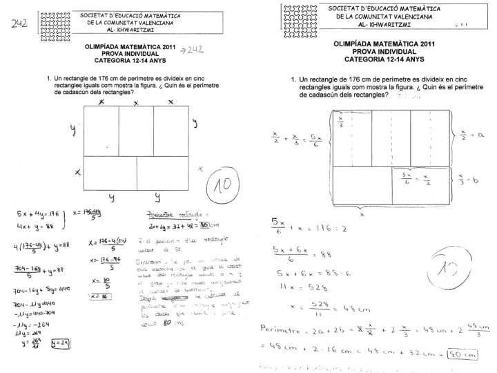 Problema 1. - Un rectangle de 176 cm. x de perímetre es divideix en cinc rectangles com mostra la figura. Quin és el perímetre de y cadascún dels rectangles? Solució. - És un típic problema de plantejament. Les incognites son les dimensions del rectangle petit: x i y I ara pasem la informació a equacions: Que el perímetre del rectangle inicial siga 176 cm, genera l’equació 176 = 5 x + 4 y. I com la part de dalt del rectangle inicial mesura el mateix que la part de baix del rectangle inicial tenim: 3 x = 2 y. I ara a resoldre el sistema: Per tant el perímetre de cada rectangle és: 2 x + 2 y = 2· 16 + 2· 24 = 80 cm
