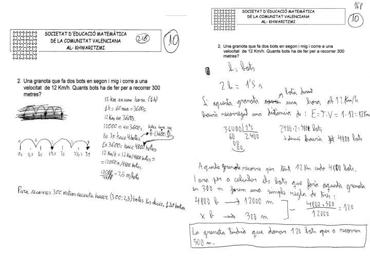 Problema 2. - Una granota que fa dos bots un segon i mig i corre a una velocitat de 12 km/h. Quants bots ha de fer per recorrer 300 metres? Solució. - Si fa dos bots en 1´ 5 segons, fa bots en un minut i (multiplicant per 60) 4800 bots en una hora. Com en una hora recorre (12 km =) 12000 metres en cada bot recorre Com a de recorrer 300 metres necesitarà = 120 bots