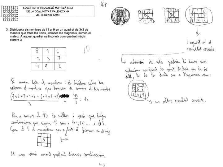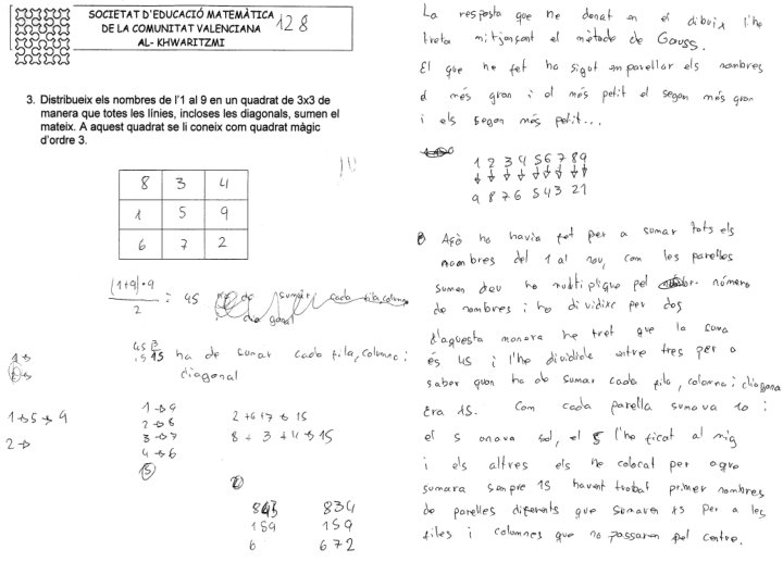 Problema 3. - Distribueix els nombres de l’ 1 al 9 en un quadrat 3 x 3 de manera que totes línies, incloses les diagonals, sumen el mateix. Solució. - Com la suma dels nou digits dona 45 i aquesta suma la hem de repartir entre 3 linies, en cada linea hi haurà suma (45/3 =) 15. A més en la posició central colocarem al (15/3 =) 5 perque participara com a diagonals i com fila i columna. Així que la tàctica es repartir els digits fican el 5 al centre i allunyan digits consecutius i obtenir les sumes de files I ara per desplaçament del digits tractem que cada suma done 15 1 4 8 13 6 5 7 18 3 9 2 14 1 6 8 15 6 1 8 4 5 7 16 3 5 7 15 3 5 7 3 9 2 14 4 9 2 15 4 9 2 8 20 17 13 15 17