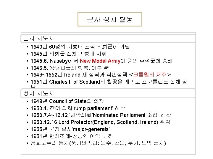 1642~46 군사령관 1649~1653년 정복 활동: 1649년 Ireland 재 정복, 1652년 Scotland 전체 정복 1653~58년 ‘Lord Protector’ of the new Commonwealth of England, Scotland, Ireland 1658. 9. 3 사망. Westminster Abbey 매장. 1660년 왕정복고 뒤 참시