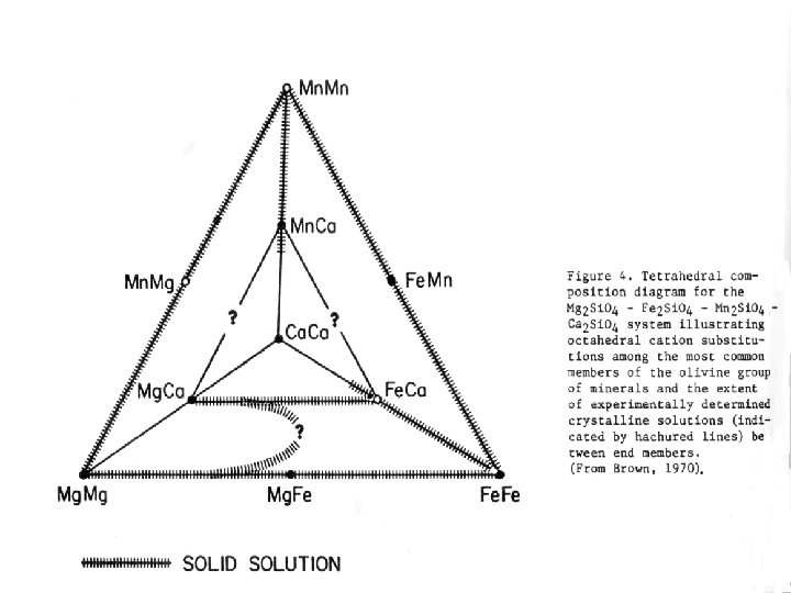 Olivine Occurrences • Forsterite - Fayalite – Fo 90 Olivine is major mineral of upper mantle – Minor phase in basalt and gabbro – Fayalite is secondary in silicic volcanics • Monticellite accessory in mantle nudules • Tephroite and glaucochroite – silicic volcanics and Mn skarns • Liebenbergite secondary in Ni deposits