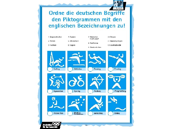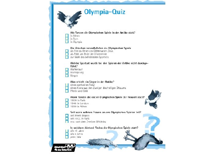 Donnerstag Projektarbeit in der Klasse Bei der Erstellung der Olympiamappe bieten sich thematisch folgende Arbeitsblätter an: - Die antiken Olympischen Spiele - Die Olympischen Spiele der Neuzeit - Was weißt du über die Olympiastadt? - Lerne das Gastgeberland kennen - Olympiarätsel und Olympiaquiz - Das Maskottchen der Olympischen Spiele - Beispiele für Fairplay - Lieder und Tänze des Gastgeberlandes - Olympische Symbole und ihre Bedeutung - Gedichte und Geschichten aus der Welt des Sports - Die Sportarten der Olympischen Spiele - Lerne des Piktogramme kennen