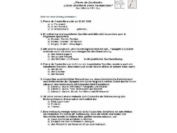 Pierre de Coubertin (1863 – 1937) Coubertin, der Begründer neuzeitlichen Olympischen Spiele, begann vor über 100 Jahren damit eine Bewegung zu schaffen, mit der er vor allem pädagogische Ziele und Reformen durchsetzen wollte. Die Olympischen Spiele selbst waren als der alle vier Jahre stattfindete öffentliche Höhepunkt gedacht, mit dem an die erzieherischen Anliegen erinnert werden sollte.