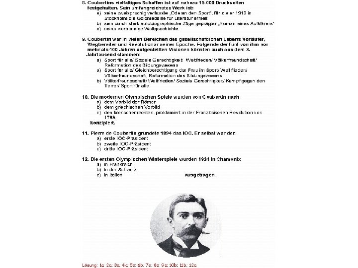 Quo vadis Olympia? Die Satzung des IOC schreibt die Gleichheit aller Rassen, der Geschlechter, Religionen und Weltanschauungen für die Mitglieder olympischen Familie vor. Olympia gilt als Symbol des friedlichen sportlichen Internationalismus, wobei das olympische Dorf, das olympische Jugendlager oder die Internationale Olympische Akademie (IOA) Stätten dieser Begegnung in besonderer Weise sind. - Die IOA unterstützt die Vorbereitung vor allem junger Menschen für Aufgeben der olympischen Bewegung. Heute ist sie auch ein Forum für Pädagogen, Trainer, Funktionäre, Wissenschaftler und Journalisten für alle aktuellen Fragen der olympischen Bewegung. - Das Olympic-Solidarity-Programm des IOC und das Sportförderungsprogramm des NOK für Deutschland unterstützen die nationalen Olympischen Komitees von Ländern der 3. Welt mit Know-how, Trainern, Lehrern, Infrastruktur und Finanzmittel. - „Olympik-Aid“, eine Solidaritätsaktion norwegischer Athleten in Lillihammes 1994 zur Unterstützung sozialer Brennpunkte auf dieser Welt, ist zum Vorbild für ähnliche Aktionen, etwa in Atlanta, geworden. - Das IOC und die NOKs unterstützen Fairplay-Kampagnen und setzen damit Zeichen gegen Unfairness in Sport, Gesellschaft, Politik, Wirtschaft und Medien. Die olympische Idee Coubertins, dass die Menschen dieser Erde über Sport, Training und Wettkampf zueinander finden, ist ein Programm für die Zukunft. - Die Reform des IOC und die Aufnahme von gewählten Athleten in seine Gremien werden in Zukunft Entscheidungen transparenten machen.
