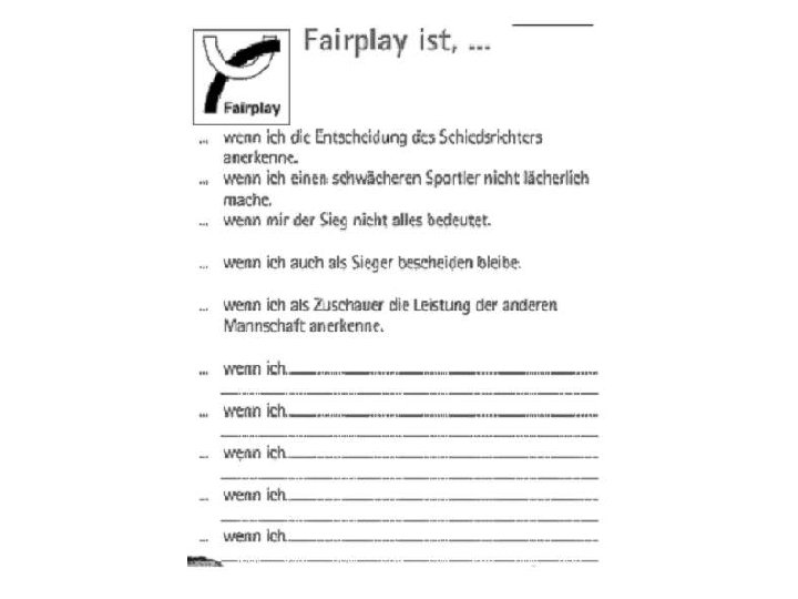 Freiwillige Beachtung von Regeln und Geboten In einer „olympischen Erziehung“ muss dem Sporttreibenden auf fairer Basis höchste Beachtung zukommen. Die Schüler sollen im eigenen sportlichen Tun, aber auch durch die kritische Reflexion in den sonstigen Unterrichtsfächern lernen: - Regeln im Sport und Spiel (aber auch im übrigen Leben) zu beachten, sie aber auch zu befragen und zu entwickeln. - Faires Verhalten zu praktizieren und sich mit dem Fairness-Gebot auseinander zu setzen (auch mit Blick auf andere Lebensbereiche). - Im Sport durch faires Verhalten eine eigene, für alle Beteiligten befriedigende, „bessere“ Welt zu gestalten. Die freiwillige Bindung, das persönliche „Ja“ zum fairen Verhalten sind gefragt. -