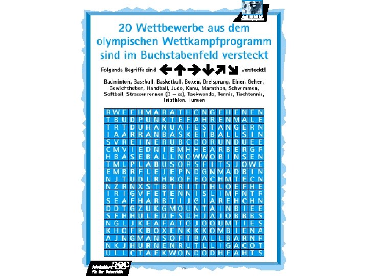 10. Du hast beim Fußball die Seitenwahl gewonnen. Gehe zwei Felder vor. 11. “Siegen um jeden Preis“, das ist Deine Einstellung. Setze drei Runden aus. 12. Wieder hast Du eine Medaille gewonnen. Rücke die Anzahl der Felder vor, die der nachfolgende Spieler würfelt. 13. Frühstart: Würfle nochmal und gehe die Augenzahl des Würfels an Feldern zurück. 14. Dein Land hat eine Goldmedaille gewonnen. Rücke drei Felder vor. 15. „Fairplay“, das ist Deine Einstellung. Rücke drei Felder vor. 16. Deine Kraft reicht für den Endspurt nicht aus. Dreimal aussetzen. 17. Für die Teilnahme an der Olympiade hast Du hart trainiert. Würfle zweimal und rücke um die erreichte Augenzahl vor. Kommst Du dabei auf Feld 18, hat das für Dich keine weitere Bedeutung