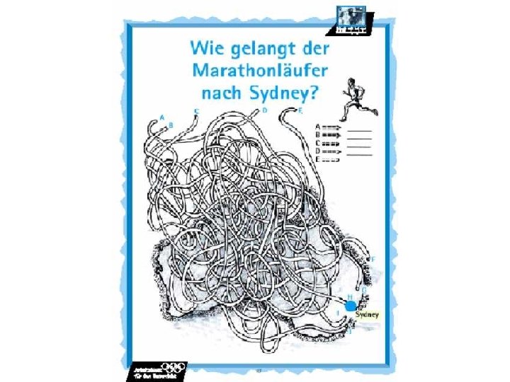 Start 1. Du hast bei der letzten Olympiade eine Goldmedaille gewonnen. Rücke 3 Felder vor. 2. Du hast Dich verletzt, weil Du Dich nicht richtig aufgewärmt hast. Setze zweimal aus. 3. Du hast dem Sieger zu seinem Erfolg gratuliert. Würfle noch einmal. 4. Du hast den Zwischenlauf erreicht, rücke zwei Felder vor. 5. Beim Weitsprung hast Du den Balken nicht getroffen. Gehe zwei Felder zurück. 6. Du bist Bestzeit gelaufen. Rücke drei Felder vor. 7. Baum Bau der Wettkampfstätten wurde nur wenig Natur zerstört. Rücke drei Felder vor. 8. Du hast Dich unfair verhalten. Gehe zurück zur Startaufstellung. 9. Deine Schule führt eine Schülerolympiade durch. Toll! Würfele zweimal.