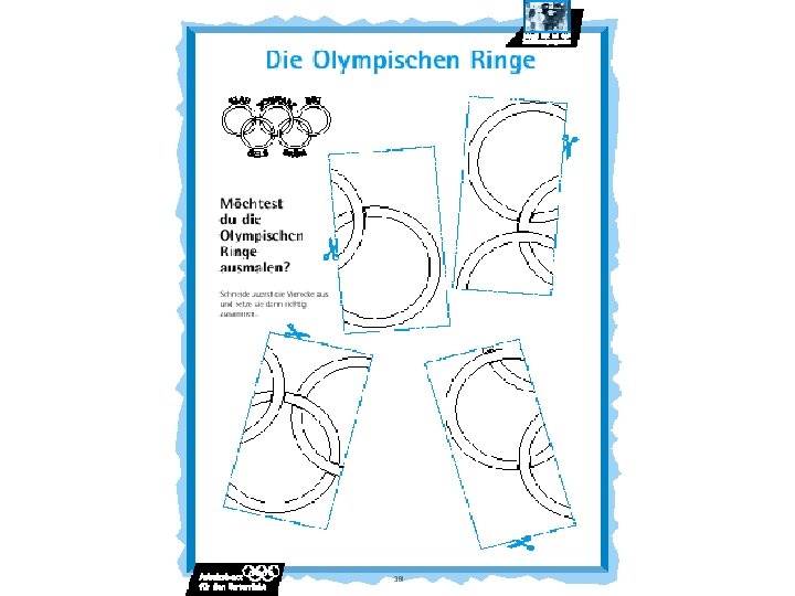 Mittwoch Workshop-Tag Am Workshop-Tag werden Kindern vielfältige Angebote gemacht, die nach Möglichkeit einen olympischen Bezug haben sollten. Im Verlauf des Vormittags können die Kinder bis zu drei Angebote wahrnehmen. Damit die Kinder möglichst frei wählen können, bietet es sich an, die Themen in drei großen Blöcken à 90 Minuten zu wiederholen. Folgende Themen könnten in den verschiedenen Workshops angeboten werden: - Prägen von olympischen Motiven - Sagen aus Griechenland - Herstellen von Flaggen der Teilnehmerländer - Knüpfen von Freundschaftsbändern - Papierfaltarbeiten - Videofilm „Olympia der Tiere“ - Memory der NOK-Broschüre - Herstellen einer olympischen Collage - Basteln von Stirnbändern in den Olympiafarben - Musikalische Begleitung des Olympialiedes - Herstellen von Buttons mit Olympiamotiven - Stempeldruck „Antike Schriften“ - Olympisches Bingo