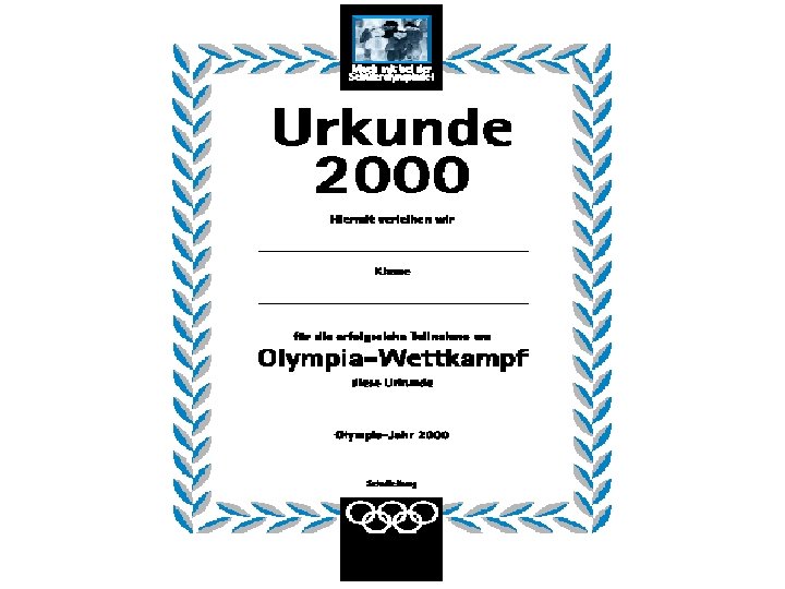 Freitag: Olympiatag Eröffnung Olympischer Fünfkampf 1. Begrüßung durch den Schirmherren (Bürgermeister, bekannter Sportler, Vertreter des Sportverbandes 2. Einzug der Teilnehmerländer - jede Klasse ein Teilnehmerland - Kinder in Landeskleidung - Flaggen der Teilnehmerländer - Musikbegleitung 3. Entzünden des Olympiafeuers 4. Leitsätze zum Olympiatag 5. Olympialied 1. 2. 3. 4. 5. Hürdenlauf Weitsprung Weitwurf Ziel-Werfen Mini-Marathon Schlussfeier 1. 2. 3. 4. Nationalhymne / Schulhymne Siegerehrung mit Fanfahren Tanz aller Teilnehmer Finale