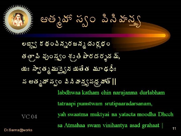 The rarest three These three things are rare indeed • Birth in human form (with special powers) • The longing for Liberation (not all possess) • The guidance of perfected teacher These are due to the grace of god Dr. Sarma@works 10