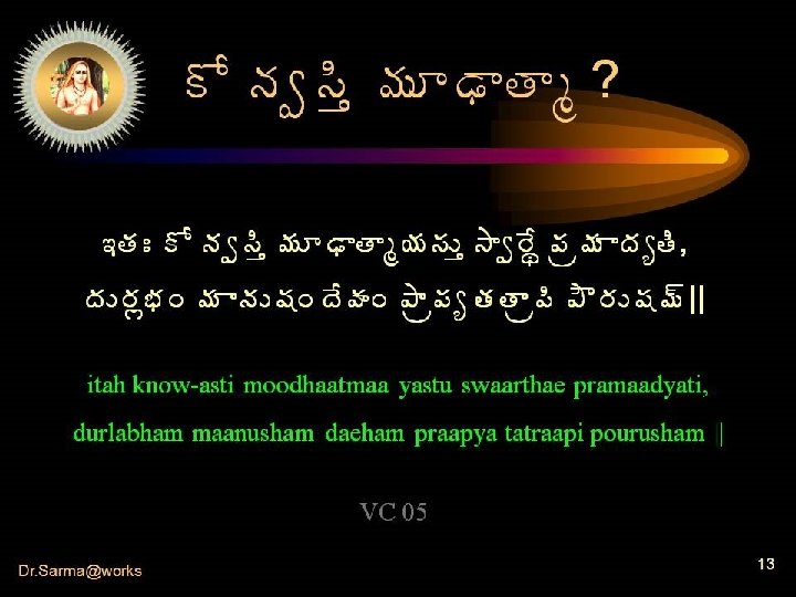 Oh! Man – commit not suicide • • Dr. Sarma@works Having been empowered with all the above said special gifts from god Isn’t it too foolish not to exert for realization Not to commit ourselves for liberation By clinging to the things so unreal Aren’t we wasting our precious gift ? Isn’t this deliberate suicide !! 12