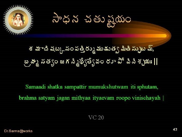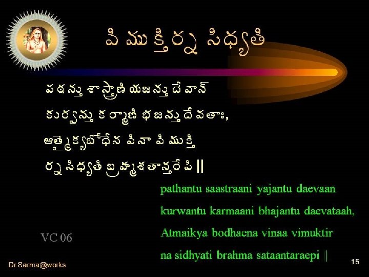 ¬Á¥ÁšʜÁê žÊªÃ� ÁÏ €œÍ ©Ã¥ÁÅ� Ëàê ¡Áë¦ÁœÊœÁ ©Ãž íþ÷ ¬ÁÏ þÁê¬Áà £ öÁê§ÁÅáðެÁåÇÿÁÐ ¬Áþ÷ ato vimuktyai prayataeta vidwaan ¬ÁþÁàÏ ¥ÁöÁþÁàÏ samnyasta ¬Á¥ÁšʜÁê žÊªÃ� ÁÏ baahyaartha sukhasprihah santam mahaantam samupaetya daesikam VC 08 œÊþÍ¡ÁžÃ´ Û§Áá¬Á¥Á ÿ Taenopadishtaartha samaahitaatmaa || 19 Ü œ é || Dr. Sarma@works