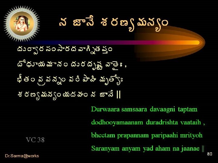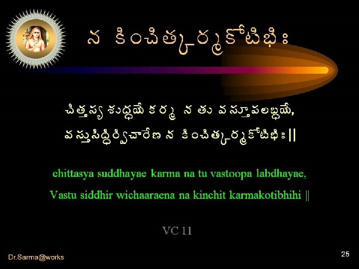 ¥ÁÏ� Á® úÁ§Á›Ï ¬Á§Áí ©Êž ÏœÁ ¬ÃŸ ãÏœÁ � ÍúÁ§ÁÏ œÁ¥Á ÍúÁ§Á¥÷ � Í©ÃÏžÁÏ ¡Á§Á¥Á þÁÏžÁÏ ¬ÁžÁÅÓ§ÁÅÏ � sarva vaedaanta¡Á뛜ͬÁéêÿÁ¥÷ sidhdhaanta gocharam||tama agocharam govindam paramaanandam sadgurum pranatosmyaham || VC 01 Dr. Sarma@works 5