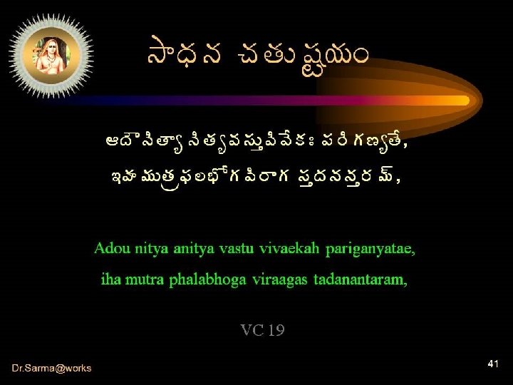 The four • Sages have prescribed four means (steps) for attainment. • Devotion to Brahman succeeds only when these four means are harmoniously utilized. • In the absence of these, this pursuit for Brahman will be only a vain attempt. Dr. Sarma@works 40