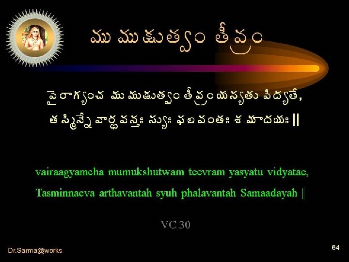 It develops • Though torpid (dull) and mediocre • This yearning for freedom develops by means of vairaagya and sama and so on • May bear fruit due to perseverance • Of course by the grace of the Guru Dr. Sarma@works 63