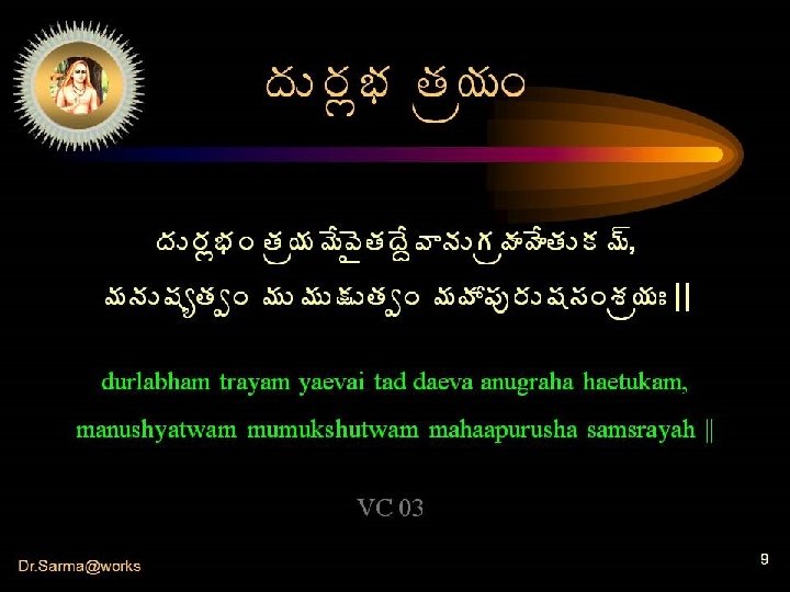 Blessed We are ! • • • Among all beings a human birth is a gift More so a fit and healthy body (male) Rarer than that is one with adequate intelligence Rarer still is inclination towards Vedic path Higher than this is discriminative ability Still higher is Realization of Identity – Brahman Isn’t this the merit of millions of births ! Dr. Sarma@works 8
