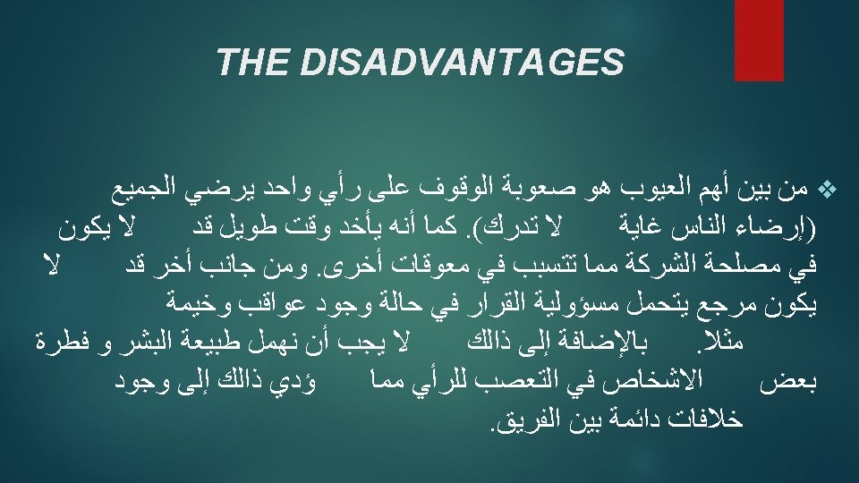 v If the team did not agree, then it’s a loss for everyone. v The team might rely too much on one another which could lead to laziness. v It could be time consuming. v It could be sometimes be more costly because it involves more individuals.