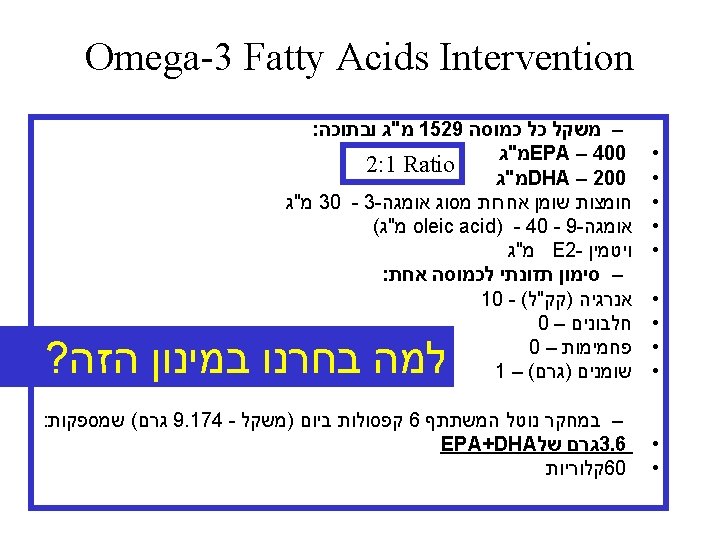 Three considerations let to this decision • First, the negligible amount of dietary omega-3 PUFA intake which characterize the Israeli population • The safety profile of omega-3 PUFA supplementation, up to 3 gram per day. • The recent clinical experience with 3. 4 gram omega-3 PUFA, delivered I. V. without reported hazards.