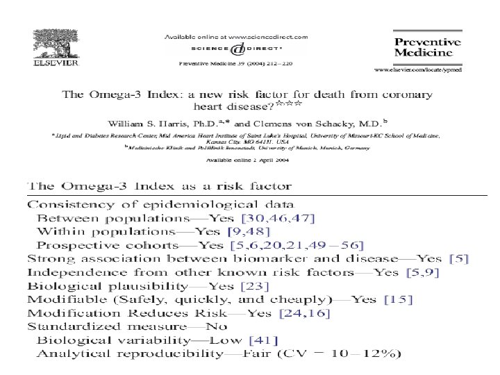 A case for the use of the Omega-3 Index as a risk stratification tool for CHD death. Harris et al. suggested that an Omega-3 Index level of ≥ 8% is a reasonable preliminary target value for reducing risk. The Omega-3 Index may represent a novel, physiologically relevant, modifiable, and independent marker of risk for death from CHD.