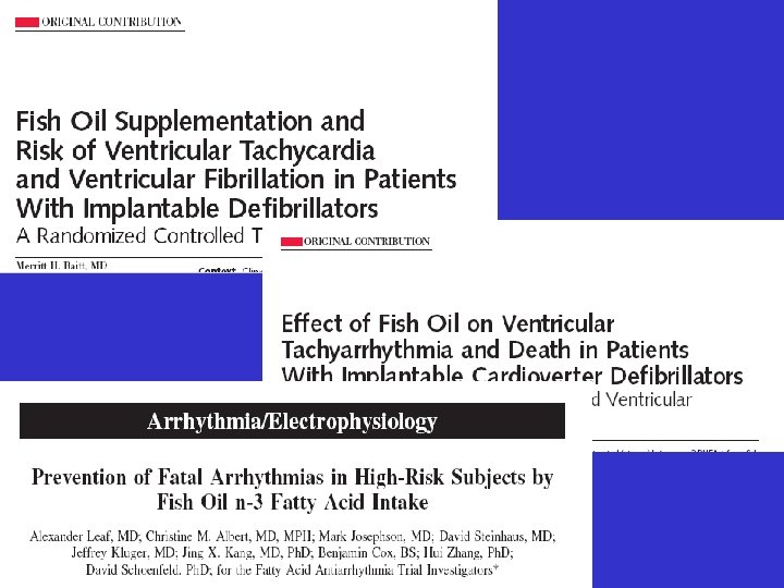 Conclusions • Although significant was not achieved for the primary end point, this study provides evidence that for individuals at high risk of fatal ventricular arrhythmias, regular daily ingestion of fish oil fatty acids may significantly reduce potentially fatal ventricular arrhythmias.