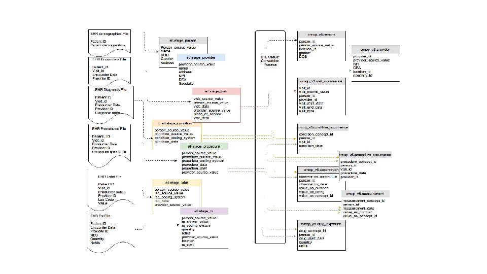 ETL Staging Tables • The ETL staging tables are designed to be similar to potential source datasets. This simplifies the import task to be just mapping to the staging tables. • The mapping to OMOP concepts and the Common Data Model are accomplished by a set of stored procedures in the database. • The tables are linked together using the source values for the person, visit and provider. • Medical data values are used in their original code sets.