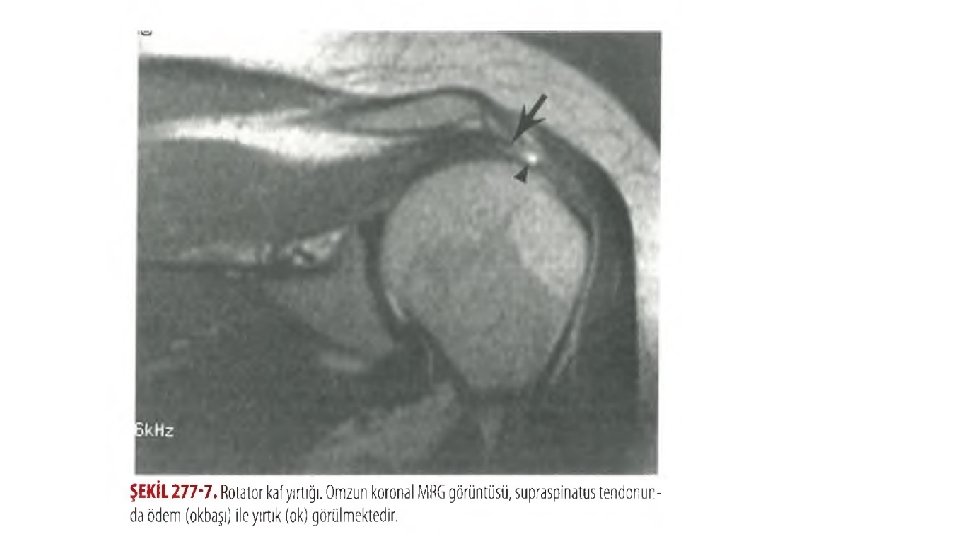 TANI • TAM YIRTIK ? • KISMİ YIRTIK ? • İNFLAMATUAR ROTATOR ? AYRIM ZOR v. Hiçbir radyografik bulgu bir akut rotator kaf yırtığı için tanısal değildir ve tanı klinik bulgulara bağlı olmalıdır. MRG, USG ve artrografı en hassas yöntemler.
