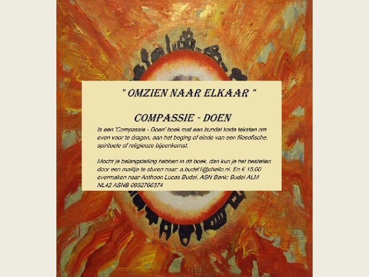 DIT IS EEN COMPASSIE DOEN-BOEK. Een bundel korte teksten en wat langere verhalen die geschikt zijn om even voor te dragen, aan het begin of het eind van een filosofische, spirituele of religieuze bijeenkomst. Ze zijn door mij ontstaan in de voorbije jaren, zo tussen 1995 tot 2018, waar mijn ideeën over geloof en religie steeds duidelijker contouren kregen in de zin van, hoe kunnen religieuze voorstellingen voor toekomstige generaties belangrijk blijven. Over hoe we in staat kunnen zijn, compassie en mededogen te integreren in ons dagelijks leven en hoe deze zichtbaar te laten worden. De meeste van deze compassieverhalen zijn door mij voorgedragen op de Open Podium avonden in het Huis van Compassie. Groenestraat 170 te Nijmegen. ‘Compassieverhalen’ kan je lezen als handreikingen die we aan elkaar kunnen voordragen, om ons er aan te herinneren, dat geloof en spiritualiteit werkelijkheid kunnen worden in ons dagelijks bestaan door elkaar tot voorbeeld te zijn. Laten we dat doen, elkaar tot voorbeeld zijn. 27 maart 2019 Nijmegen