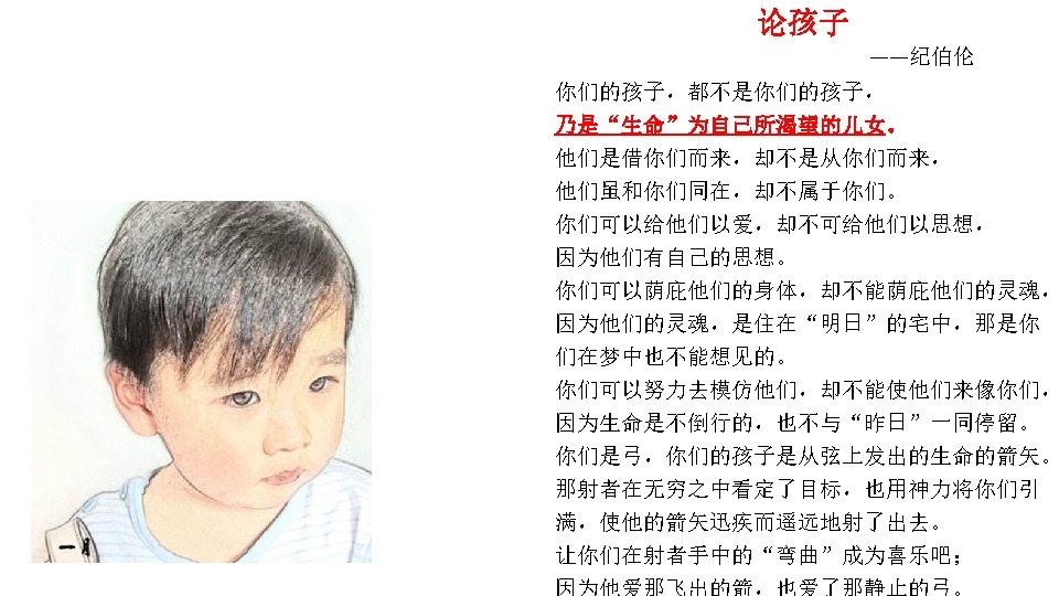 On Children Your children are not your children. They are the sons and daughters of Life’s longing for itself. They come through you but not from you, And though they are with you, yet they belong not to you. You may give them your love but not your thought For they have their own thoughts. You may house their bodies but not their soul For their souls dwell in the house of tomorrow, Which you cannot visit, not even in your dreams. You may strive to be like them, But seek not to make them like you, For life goes not backward nor tarries with yesterday. You are the bows from which your children As living arrows are sent forth. The archer sees the mark upon the path of the infinite, And He bends you with His might, That His arrows may go swift and far. Let your bending in the archer’s hand be for gladness; For even as He loves the arrow that flies, So He loves also the bow that is stable