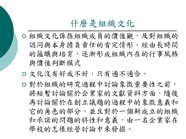 Symbolism and the Creation of Organizational Cultures (組織文化的象徵性與創立) ¡ 企業家可以看出不僅是創造者一些比較理性的及有形 的方面事情,如組織結構和技術方面等,而且也作為 創新的象徵性、意識形態、看法、信仰、習慣和虛構 的事物,更多的文化方面是表現力和構成的組織生活, 因此代表了新的組織設置可以研究的轉變過程的信念, 從沒有信仰到新的信仰,從沒有規則到新規則的成立, 從沒有文化到新的文化,並在總體上觀察到的轉變思 想的結構與表現方式。(Entrepreneurs may be seen not only as creators of some of the more rational and tangible aspects of organizations such as structures and technologies but also as creators of symbols, ideologies, languages, beliefs, rituals, and myths, aspects of the more cultural and expressive components of organizational life. New organizations thus represent settings where it is possible to study transition processes from no beliefs to new beliefs, from no rules to new rules, from no culture to new culture, and in general terms to observe the translation of ideas into structural and expressive forms)