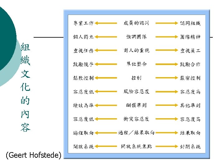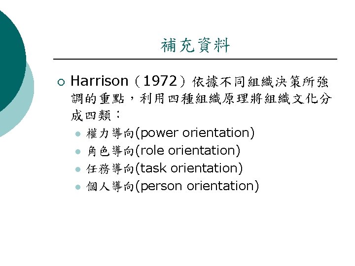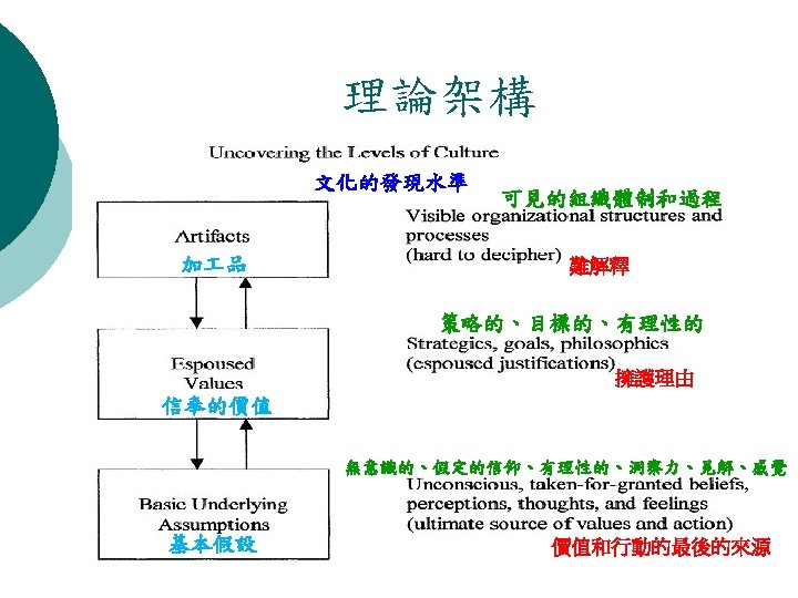 Organizational Culture Theory 組織文化理論說明 ¡ Main independent construct(s)/factors(s) : l Organizational culture type, organization culture strength, and culture congruence. (次要學說:組織文化的形式、組織文化的強度、文化的適合度) ¡ Originating l l Edgar Schein(埃德加 沙因) Andrew Pettigrew(安德鲁 佩蒂格鲁) ¡ Level l authors(s) : of analysis : Organization, Group, Individual