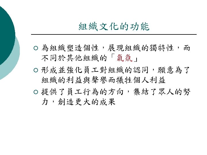 The Concept of Organizational Culture (組織文化的概念 ) ¡ 文化是公開的系統和在某ㄧ特定時期某ㄧ群 集體接受某種意涵 (Culture is the system of such publicly and collectively accepted mean-ings operating for a given group at a given time. ) ¡ 人所擁有的發明與溝通能力與其他動物相比 , 的確是認為是獨特的 (Indeed what is sup-posed to be distinctive about man compared with other animals is his capacity to invent and communicate determi-nants of his own behavior (White, 1949; Cassirer, 1 953). )