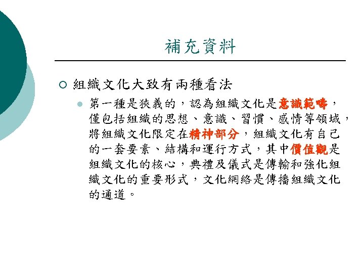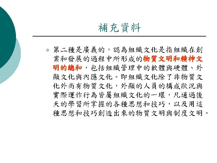 參考來源 ¡ ¡ 管理學, 張緯良 著, 雙葉書廊出版,組織文化社會責任與管理道德, http: //www. fgu. edu. tw/newpage/fguwebs/sjfungweb/upl oad/images/File/management/fchap 05. ppt 盧萬方,香港大學教育學院,新高中中國語文課程學與教系列(4) 選修單元四:文化專題探討, http: //www. edb. gov. hk/File. Manager/TC/Content_5805/Session _1 -_Mr. %20 Lo. ppt 洪啟昌 著, 國立政治大學 教育研究所 博士論文, 2004, 教育行政機關組織 文化、知識管理與組織學習關係之研究 http: //nccuir. lib. nccu. edu. tw/handle/140. 119/32965 Edgar H. Schein, Organizational Culture , American Psychologist Feb. Vol. 45, 1990, 109 -119