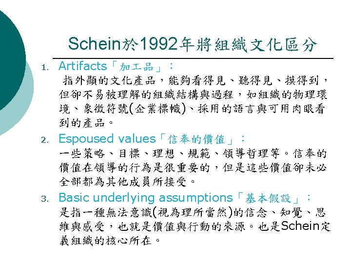 Organizational Culture Theory 組織文化理論說明 ¡ 主要文獻: l Edgar Schein(埃德加 沙因) – Organizational Culture and Leadership( 組織文化與領導) ¡ Alternative Name: Corporate culture Main dependent construct(s)/factor(s) : l Performance, organizational effectiveness, employee commitment, employee satisfaction. l ¡ (主要學說:成就、組織效果、對員 承諾、員 的滿意度)