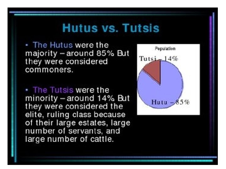 • BELGIUM CAUSED CIVIL WAR BY FORCING MEMBERS OF THE HUTU AND TUTSI TRIBES LIVING THERE TO CARRY IDENTITY CARDS SAYING WHICH TRIBE THEY BELONGED TO. MOST DID NOT KNOW WHAT TRIBE THEY BELONGED TO. • BELGIANS DECIDED IF YOU OWNED MORE THAN 10 COWS, YOU WERE TUTSI. • AS A RESULT, THE TUTSI GOT THE BEST EDUCATION AND JOBS. • CIVIL WAR BROKE OUT. THE TUTSI WON AND SET UP THE GOVERNMENT OF RWANDA IN 1994.