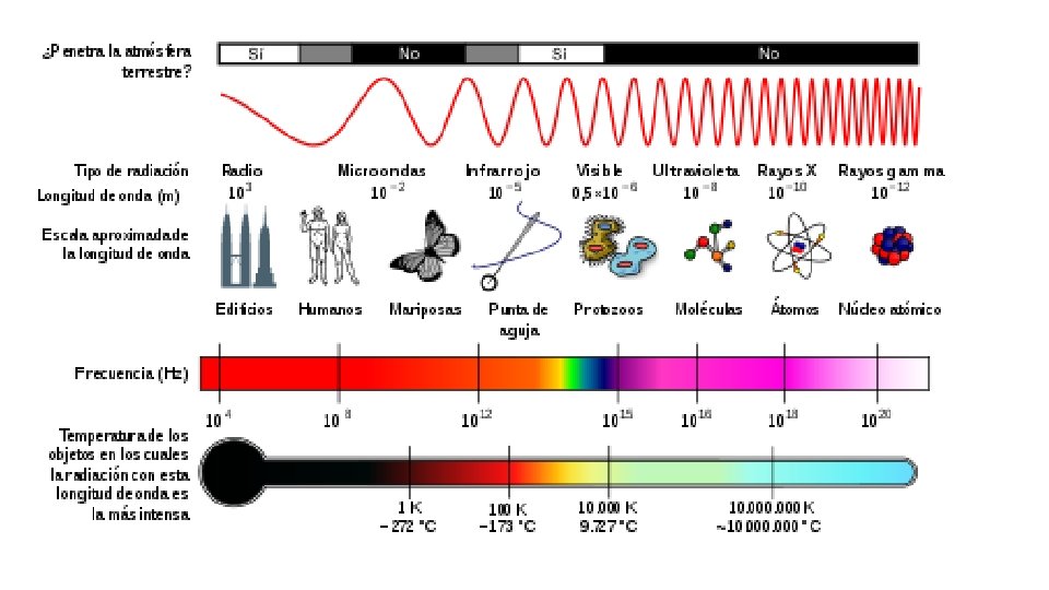 ESPECTRO ELECTROMAGNETICO El espectro electromagnético es el conjunto de longitudes de onda de todas las radiaciones electromagnéticas. Tiene rangos de frecuencias enormes La longitud de onda λ esta relacionada con la frecuencia mediante 3�� 108� /� �� c=f λ