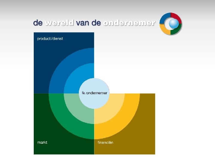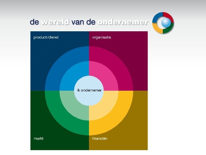 Hier besteedt een gemiddelde ondernemer zijn tijd aan. • Product 30% van de tijd, • Markt 20%, • Financiën 25 %, Welkom • Organisatie 25 %.