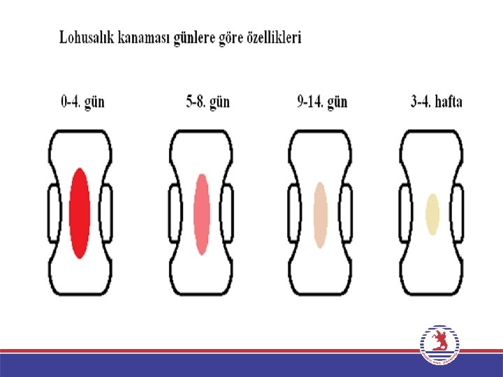 Akıntı Kontrolü (Loşia) • Miktar, renk ve özellikle eşlik eden kötü koku varlığı Kontrol edilmelidir. • Doğum sonrası ilk 2 gün kırmızı vişne çürüğü renkte bir akıntı olağandır. (Loşia Rubra) • 2 -10 günler arası renk pembe-kahverengi hale döner. (Loişa Seroza) • Lekelenme tarzında kanama doğumdan sonra özellikle emziren annelerde 10 günden 6. haftaya kadar devam edebilir. (Loşia alba)