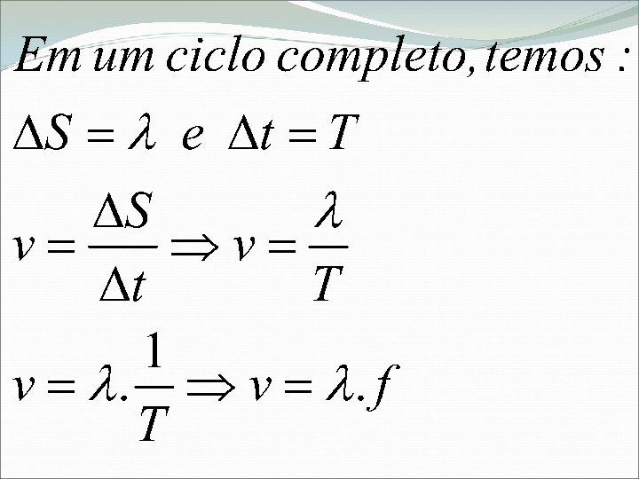 Período (T) É o tempo necessário para que uma onda percorra um comprimento de onda, ou seja, é o tempo de duração de uma oscilação completa.