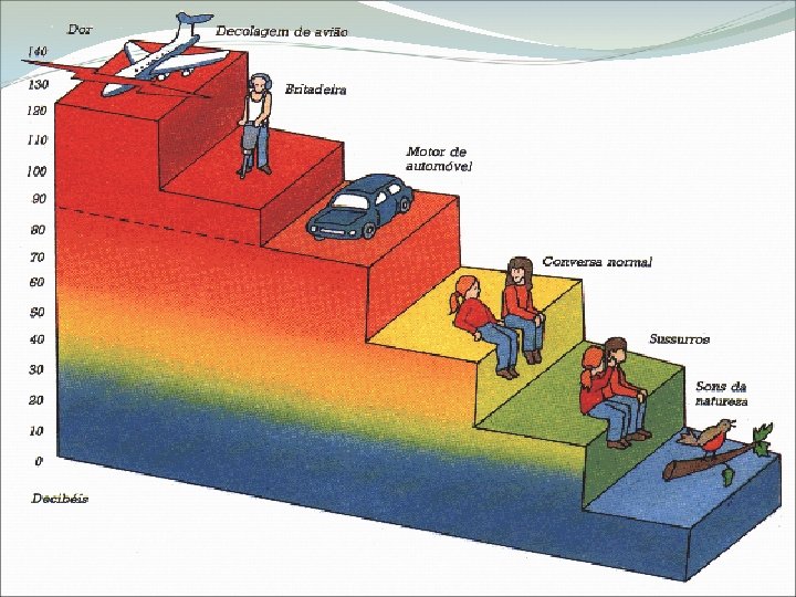 Nível de Intensidade Sonora nível de intensidade sonora e é medido em d. B (decibel) I intensidade sonora da onda; I 0 = 10 -12 W/m 2