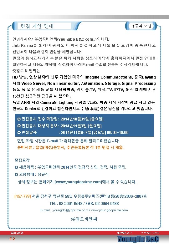 찾아 오시는 길 회사 약도 우림 블루나인 비즈센터 B동 A동 대중 교통편 지하철 9호선 증미역 2번 출구 100 m 공항버스 6018 일반버스 1002, 670 , 672, 6627 , 6631 , 6642 , 6712 [157 -779] 서울 강서구 양천로 583, 우림블루 9 비즈센터 B동(20층)2006~2007호 TEL: 02 -3664 -9548 / FAX: 02 -3664 -9488 E-mail : youngdo@ydprime. com / www. youngdoprime. com ㈜영도비앤씨 2021 -09 -21 #5 ⓒ 2014 Youn g. Do B Copyright & C. All rights reserved