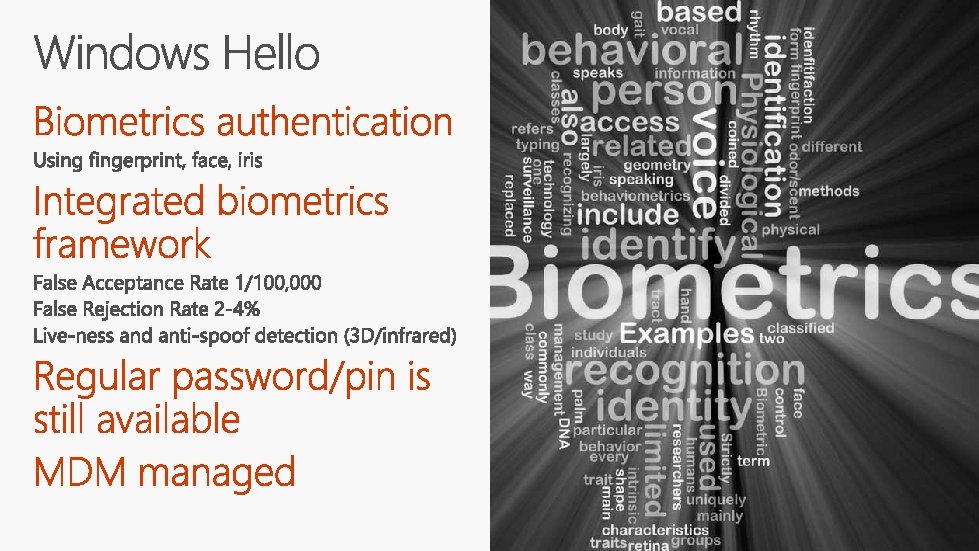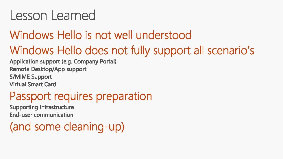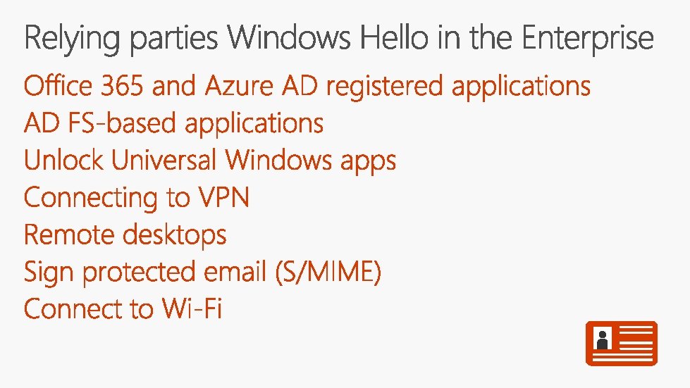 Device-based, multi-factor Replace passwords with private key Unlocked solely through a “user gesture” Based on asymmetrical key pair or certificate IT Pro and user familiarity Single “unlock gesture” provides access to multiple credentials (origin isolated) Azure AD identity provider Azure AD validates and proofs user with OTP, or Multi-Factor authentication Azure AD maps public key to a user account Private key is never shared Keys are always generated in hardware (TPM) Hardware bound keys are attested (Trusted Computing Group Protocols)